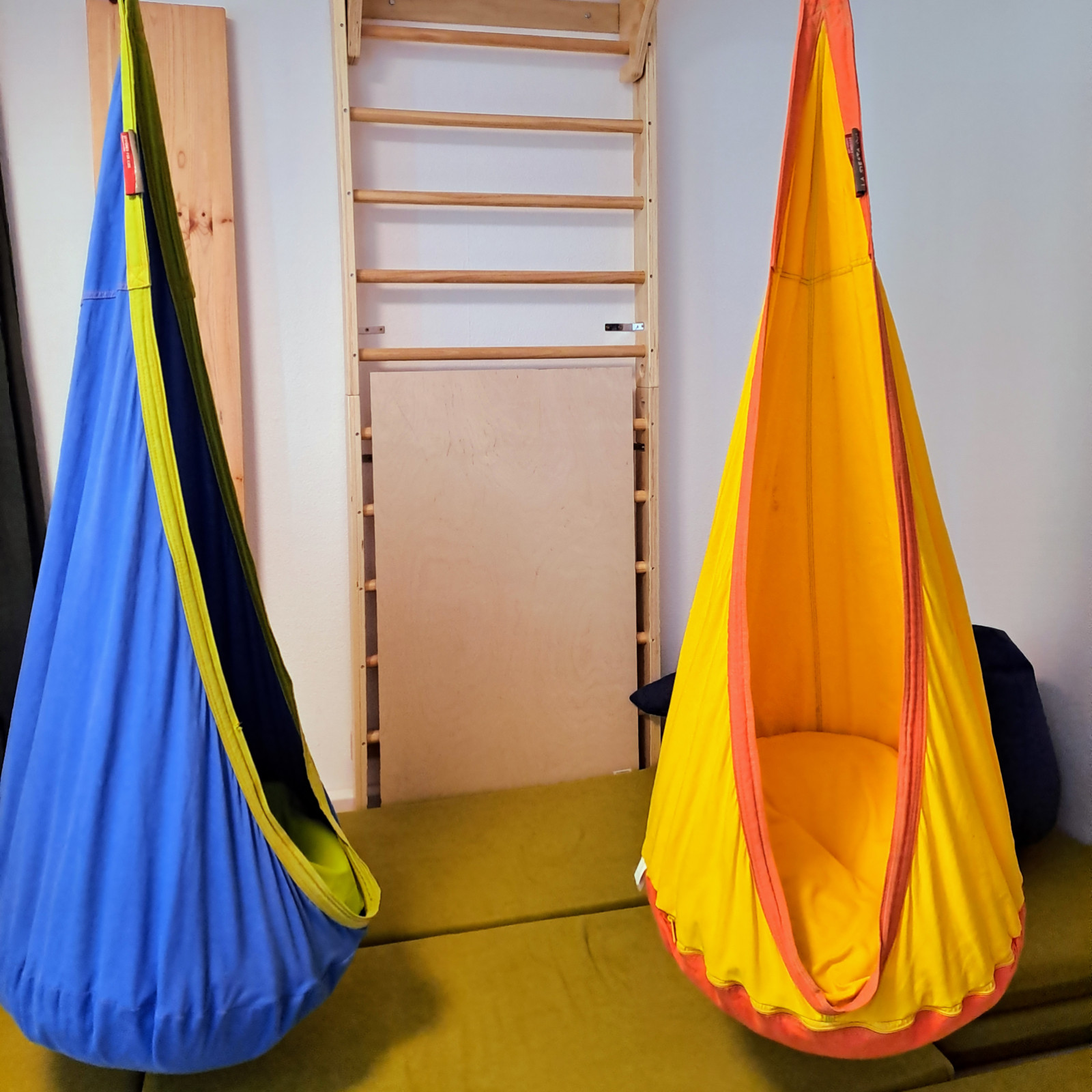 Sprossenwand, Hängehöhlen und eine Hängematte.