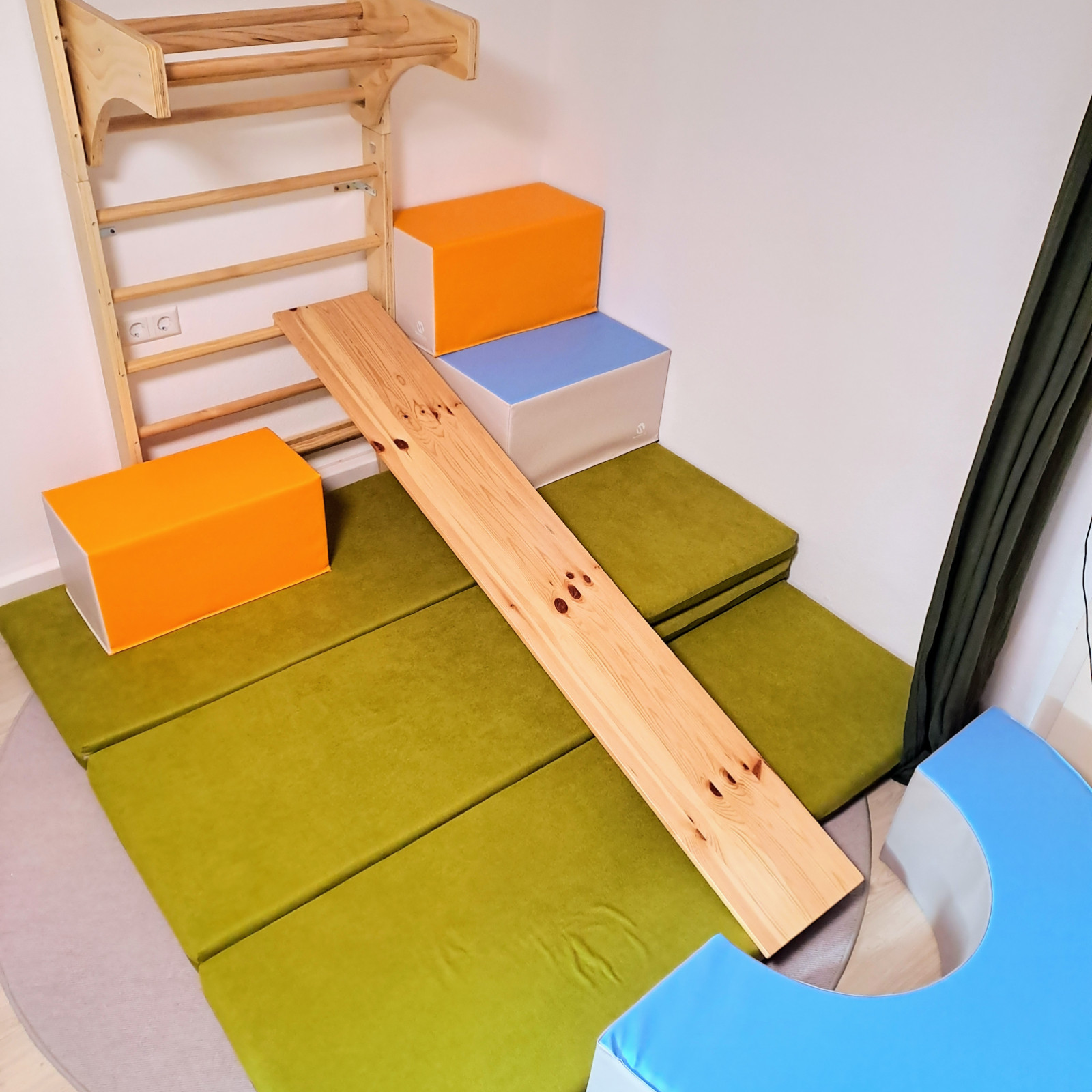 Dazu gehören Motorikbausteine, ein Rutsch- und Balancierbrett, eine